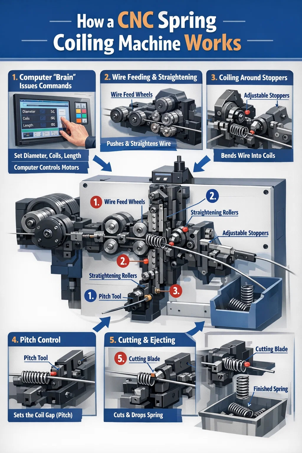 Uma máquina enroladora de molas CNC é uma máquina de precisão controlada por um "cérebro" de computador, projetada especificamente para enrolar fios de metal em molas helicoidais.