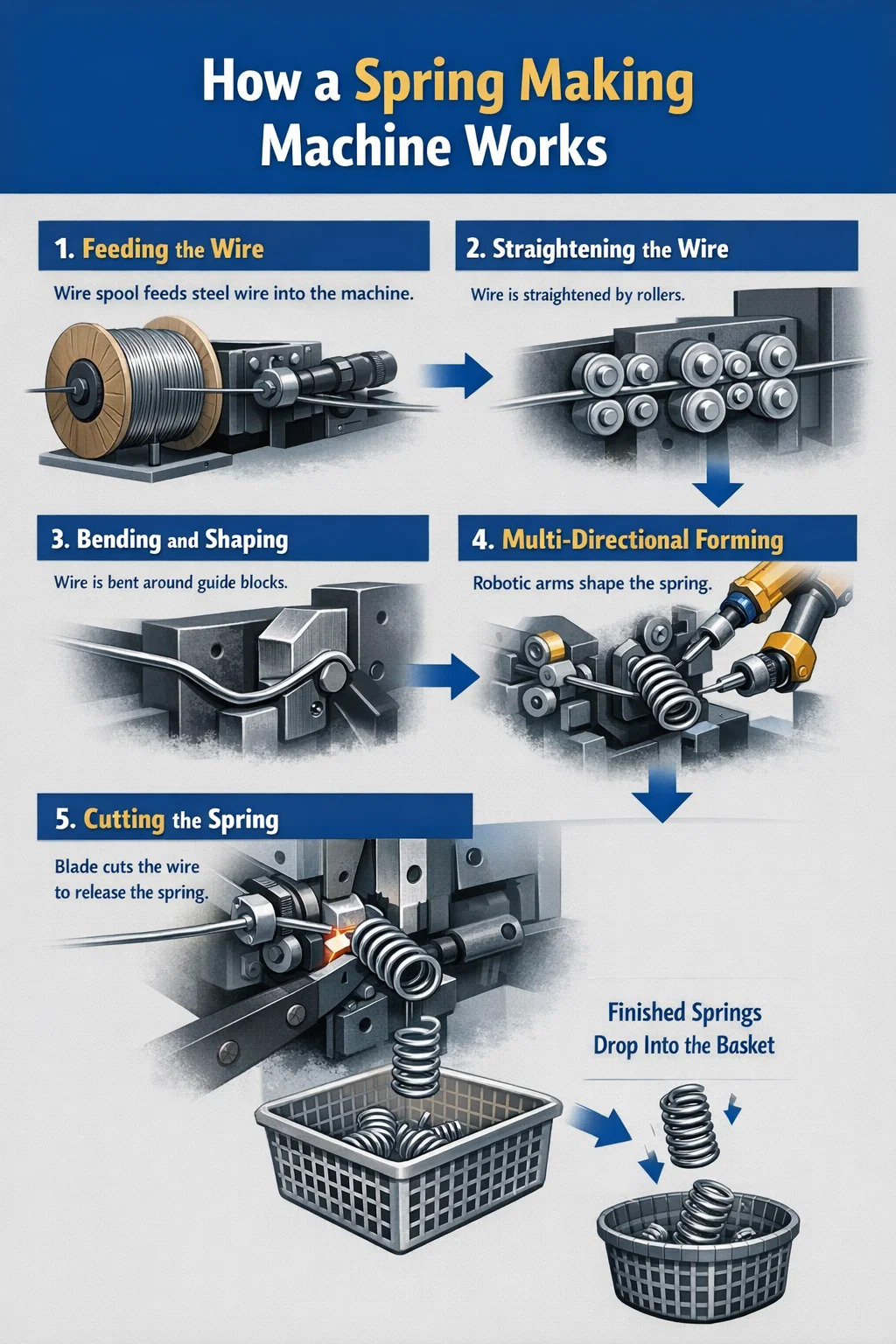 As máquinas modernas de fabricação de molas geralmente possuem vários braços robóticos móveis. Se forem necessárias molas com ganchos ou formatos incomuns, esses braços robóticos se estendem em várias direções – para cima, para baixo, para a esquerda e para a direita – dobrando o fio no formato predeterminado, como se fosse dobrar um fio manualmente.