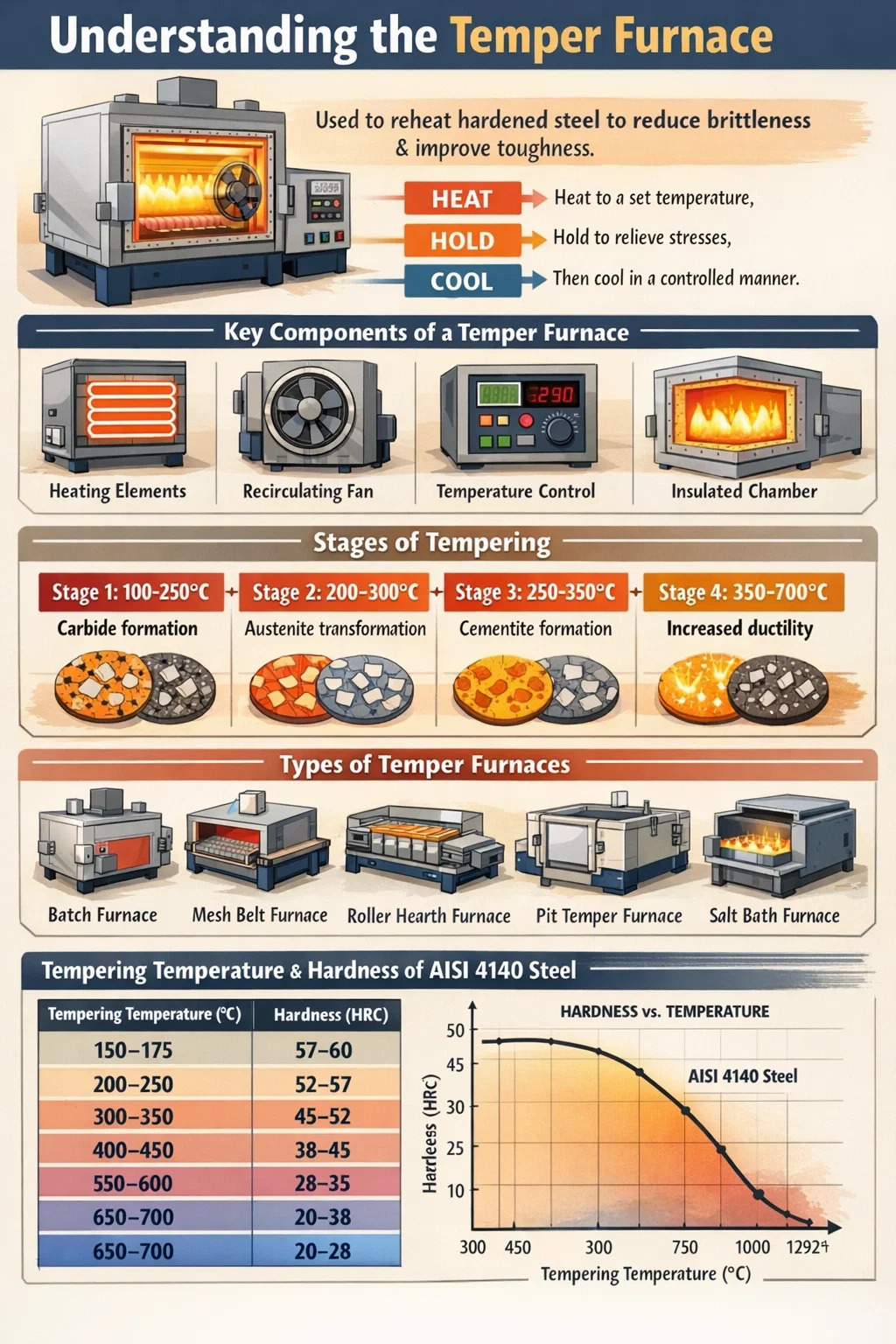 O princípio de funcionamento de um forno de têmpera é baseado na metalurgia térmica controlada. Queo o aço é temperado após a austenitização, ele se transforma em martensita – uma estrutura cristalina tetragonal supersaturada, centrada no corpo, que é extremamente dura, mas altamente tensionada e quebradiça. O revenido, realizado dentro do forno de têmpera, desencadeia uma série de transformações de fase controladas por difusão dentro da martensita que reduzem progressivamente a tensão e restauram a ductilidade.